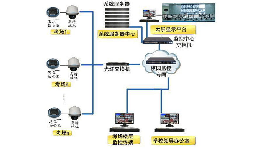 通过在考试现场设立视频监控点, 将监控图像实 时传输到各级教育部门和其它相关部门, 通过对图像的浏览、 记录等方式, 使各 级教育部门和其它相关部门直观地了解和掌握考场的动态, 从而有效提高考试管 理水平,达到更好考试效果,创造更加公平、公正、和谐的考试环境。