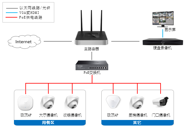 考虑到餐厅后期的发展和扩大,可以在现有网络拓扑中灵活增添无线、监控设备。商用无线AP可支持PoE供电、FAT模式自主管理。